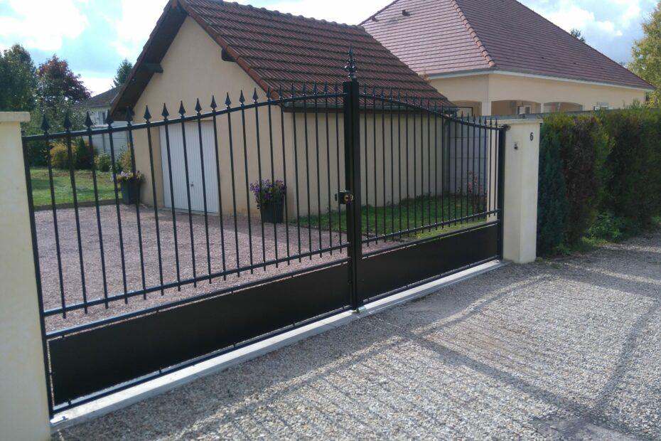 Portail chapeau de gendarme 2 vantaux semi-ajouré ACIER Portail fabriqué sur mesure dans nos ateliers Ossature en tube carré & rectangulaire Soubassement en tôle plane EZ Remplissage en fer rond avec fer de lance Portail thermolaqué (sablage + traitement de… Portail Acier 2 vantaux -coloris Noir